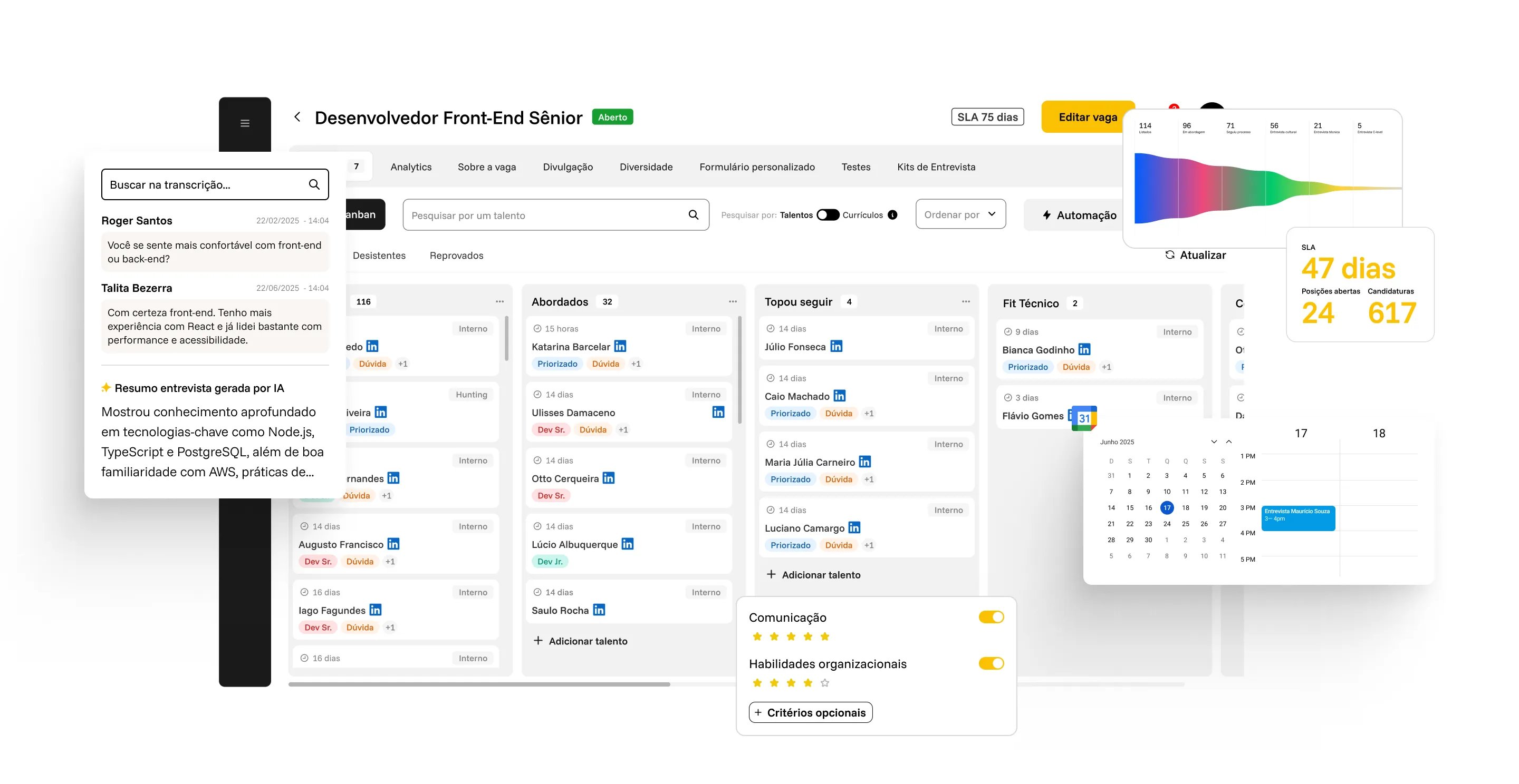 Organize seu processo em um só lugar, com triagem inteligente, entrevistas estruturadas e automações que economizam tempo.